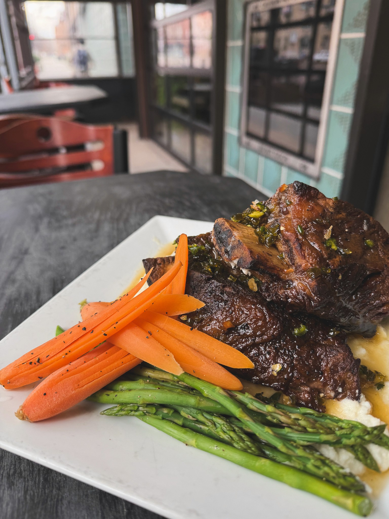 braised beef short ribs, cauliflower puree, asparagus, baby carrots, jalapeno honey