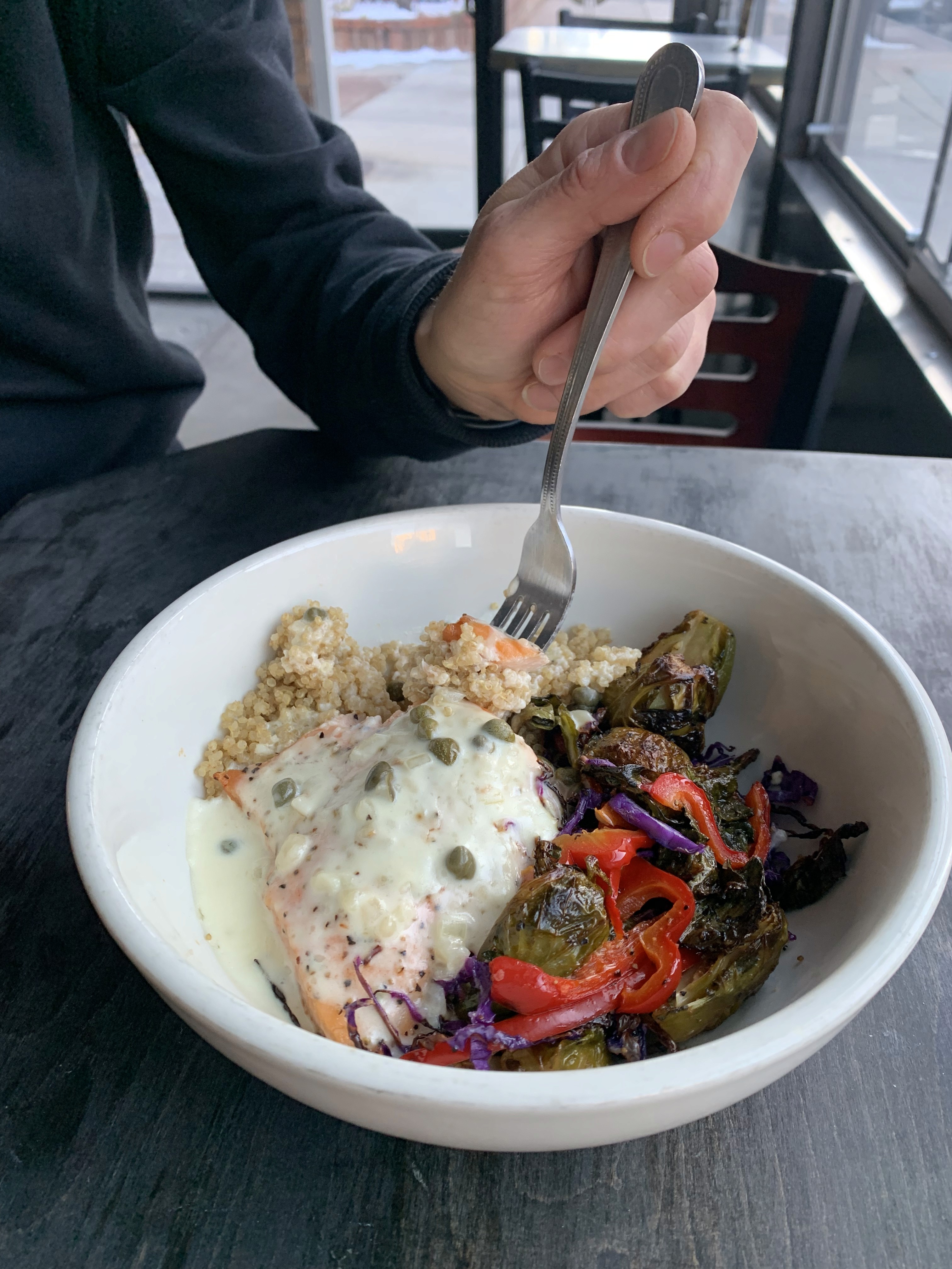 baked salmon, garlic quinoa, roasted brussel sprouts, red bell pepper, red cabbage, with a lemon caper cream sauce