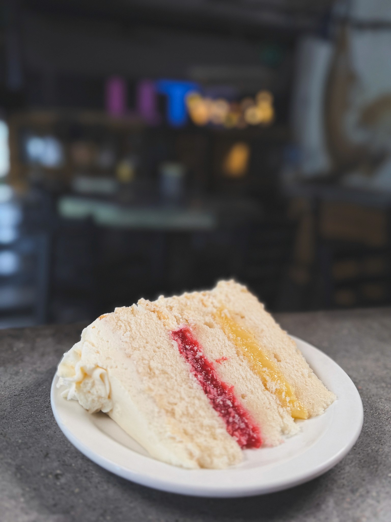 vanilla cake, fresh raspberry jam, lemon curd, white chocolate cream cheese frosting