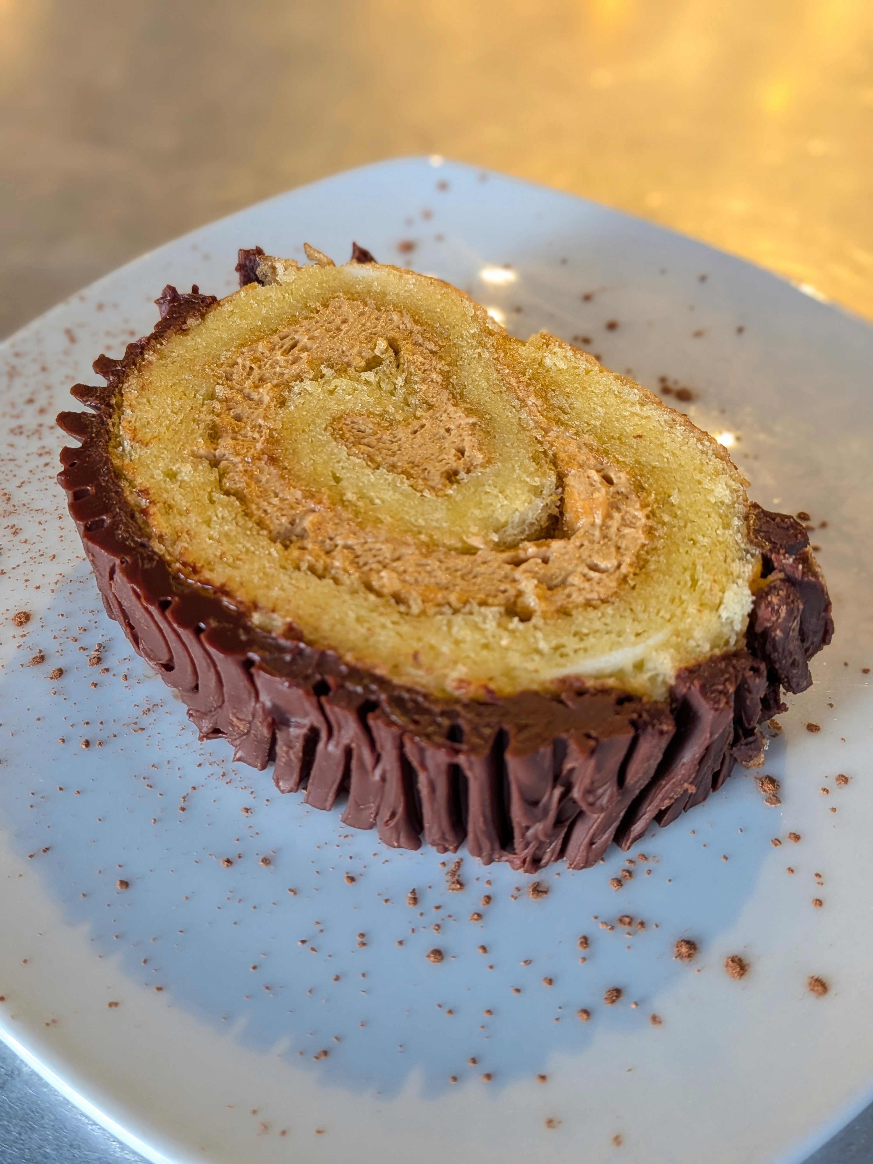 light vanilla chiffon cake swirled with a smooth caramel-espresso cream and coated with a rich chocolate ganache