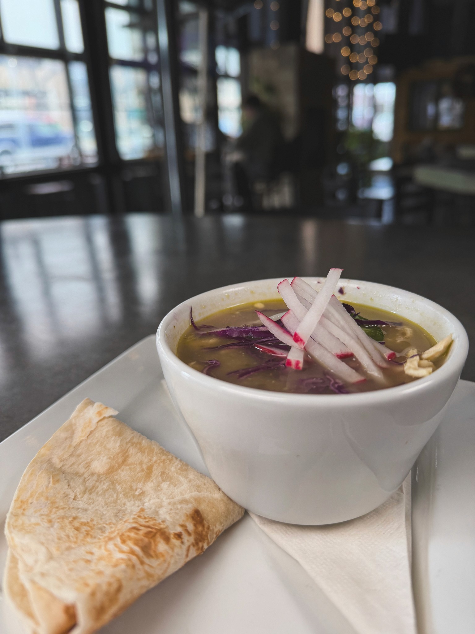 2 tacos, pickled onion, lime sour cream, cotija, cup of green chili soup